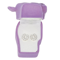 Horseshoe earrings with clear rhinestones are packaged in a velour pony head gift box.