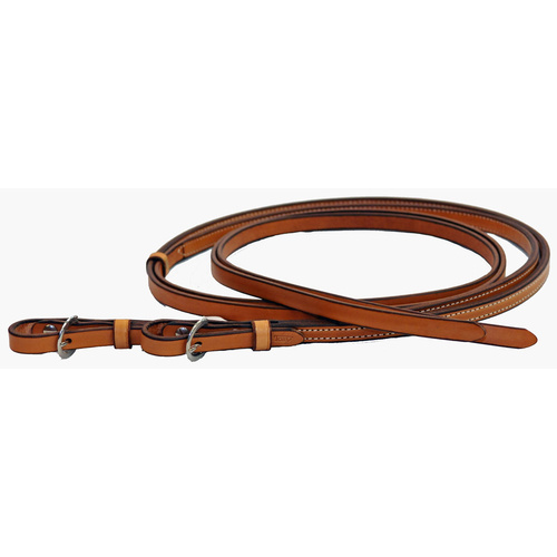 Partial double and stiched leather reins. Buckle ends. 7' 6" long. 5/8" wide.
