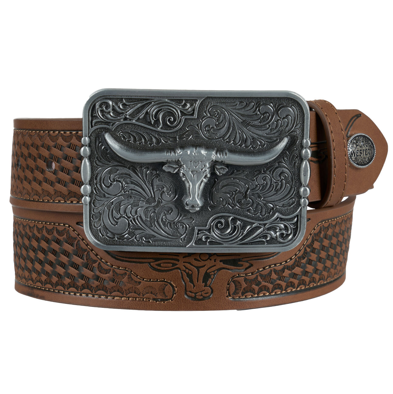 Featuring a beautifully detailed strap with longhorn and basketweave tooling, this belt showcases traditional Western craftsmanship with a bold, rugged edge. The antique silver hardware adds a vintage-inspired touch, while the Pure Western concho provides a signature finish that reflects quality and attention to detail.