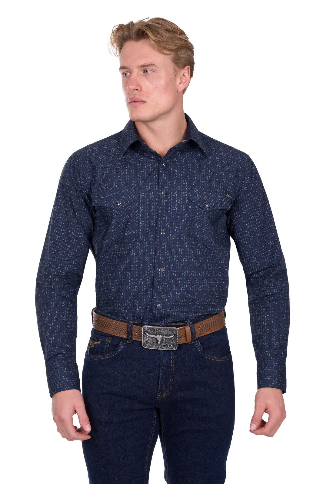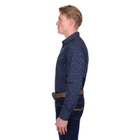 Bring authentic western style to your wardrobe with the Men’s Marc Print Western Long Sleeve Shirt in navy. Featuring a bold geometric print with longhorn motifs, this shirt blends traditional cowboy styling with modern comfort, making it perfect for everyday wear, country events, or the rodeo.