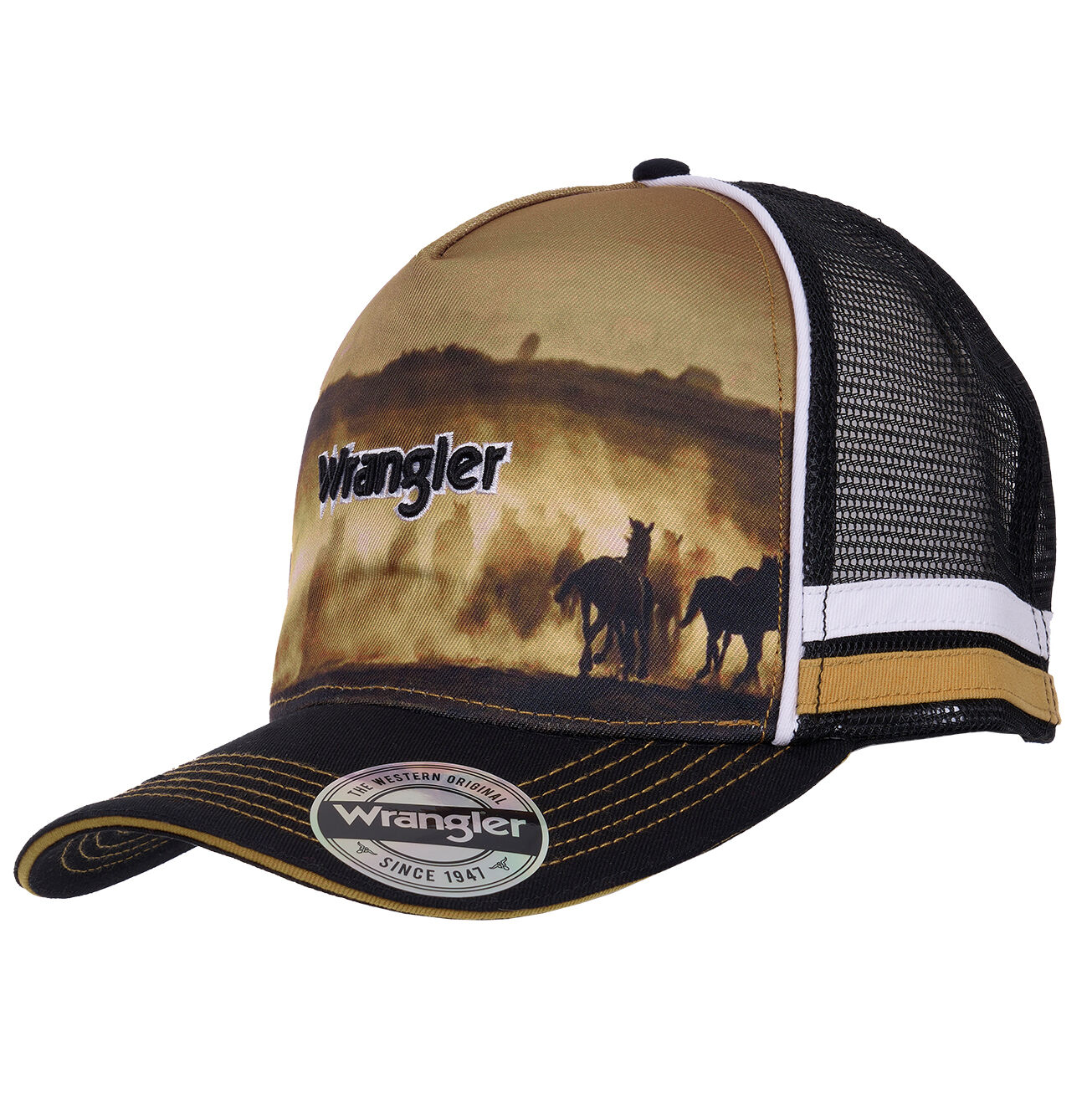Eye-catching details include contrast top stitching on the peak, a contrast sandwich peak, side panel taping, and contrast crown piping for a premium western look. The crown showcases a full wild horses scene print, finished with an embroidered Wrangler logo for authentic branding.